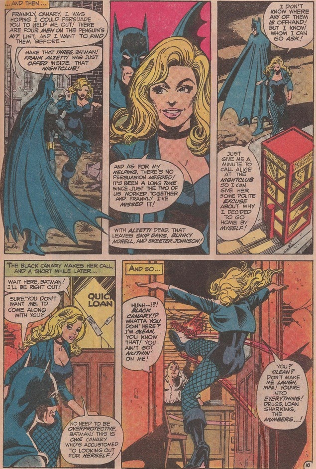 Dinah examines the victim and then notices the Penguin slipping through the crowd and exiting the night club. Dinah tells her friend Alice that she's not feeling well because of the noxious gas floating around the dead guy's table. But when she sneaks away...