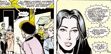 In Green Lantern #188: "Decent Exposure" the press outs the new Green Lantern's secret identity, architect John Stewart. Some people take the revelation in stride, but Ollie doesn't and calls Hal Jordan to vent his frustration. Dinah appears in the background.